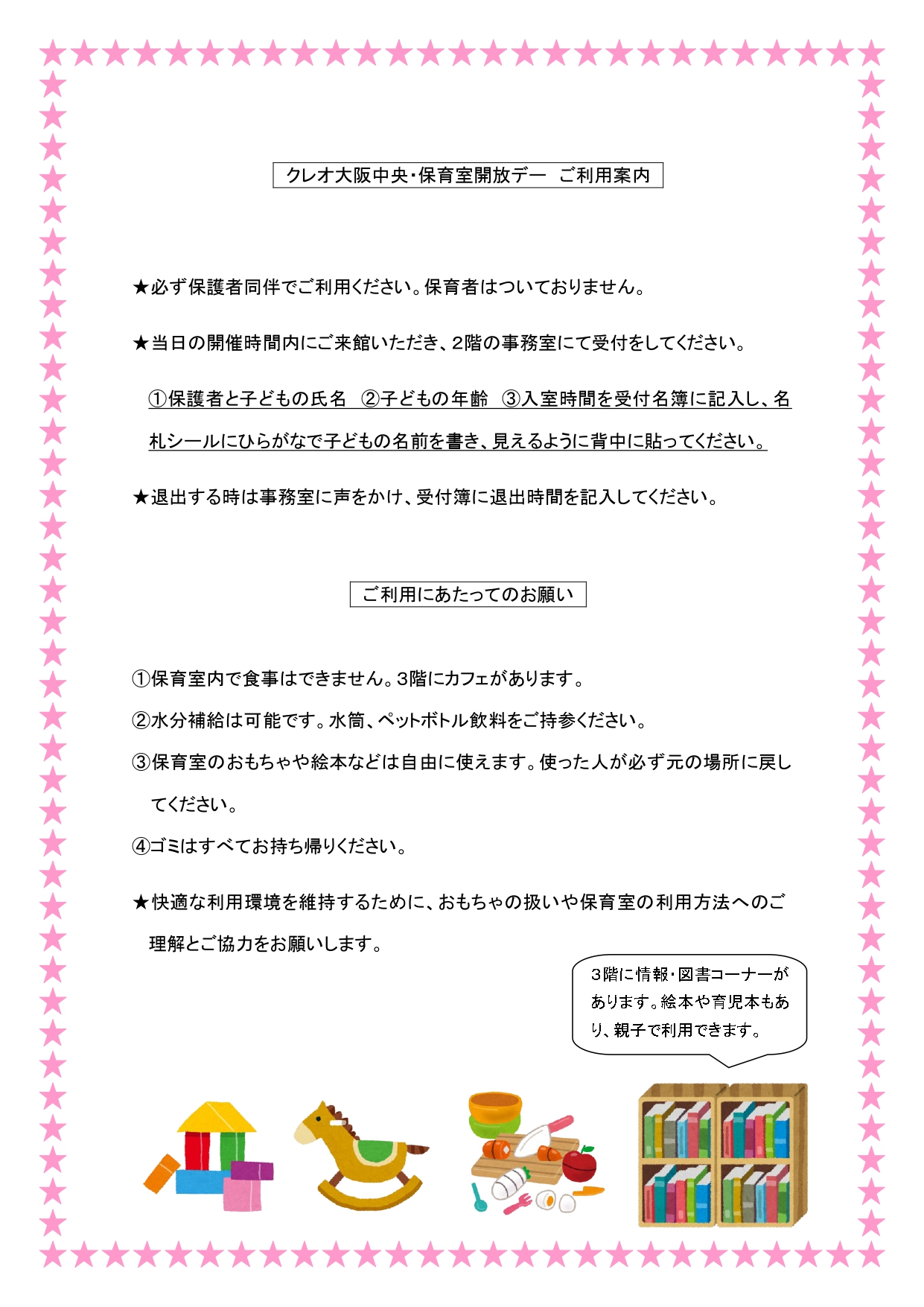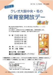 日にち限定で、就学前のお子さんと保護者を対象に、保育室を開放します。 クレオ大阪中央の暖か~い保育室に、親子で遊びにいきませんか?