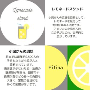 *レモネード&レモングッズ販売 【NPO法人おおさかレモネードスタンドプロジェクトPilina】 10:30~16:00 売り切れ次第終了 レモネード¥400 レモン雑貨販売¥250~ |